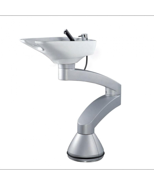 Мойка-трансформер для мытья волос двух коленная. Комплектуется мелкой белой керамической раковиной, комплектом смесителя с черным пластиковым душиком и хромированным дозатором под шампунь. Каркас серебристый.