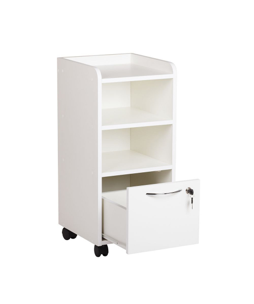 Тележка представляет собой тумбу на колесных опорах с двумя открытыми отделениями и одним выдвижным ящиком с замком. Цвет ламинированного ДСП любой из представленных на сайте.