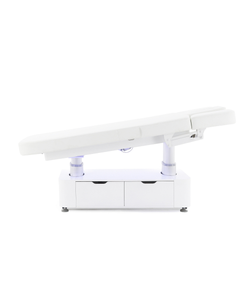 Стол изготовлен с учётом всех потребностей современной индустрии красоты. Мягкое и комфортное ложе имеет несколько секций и 4 мотора для плавной регулировки высоты и угла наклона подвижных частей. Рама изделия выполнена из стали высокой прочности и выдерживает нагрузку до 150 кг, что гарантирует долгий срок службы оборудования.